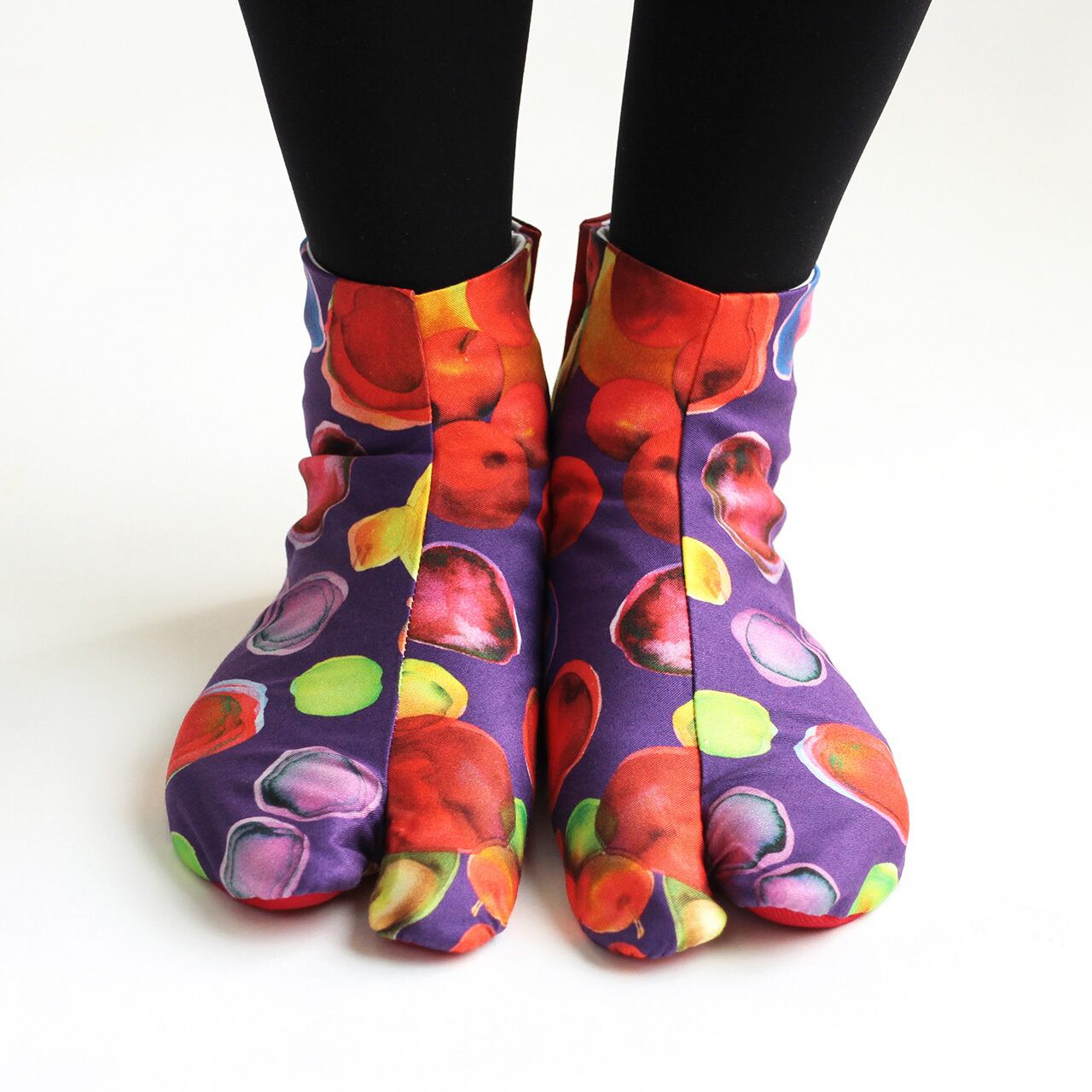 言葉では表現できない感覚やインスピレーションを描いたグラフィックアートのオリジナルファブリックを足袋職人さんによって丁寧に仕立て頂いています。