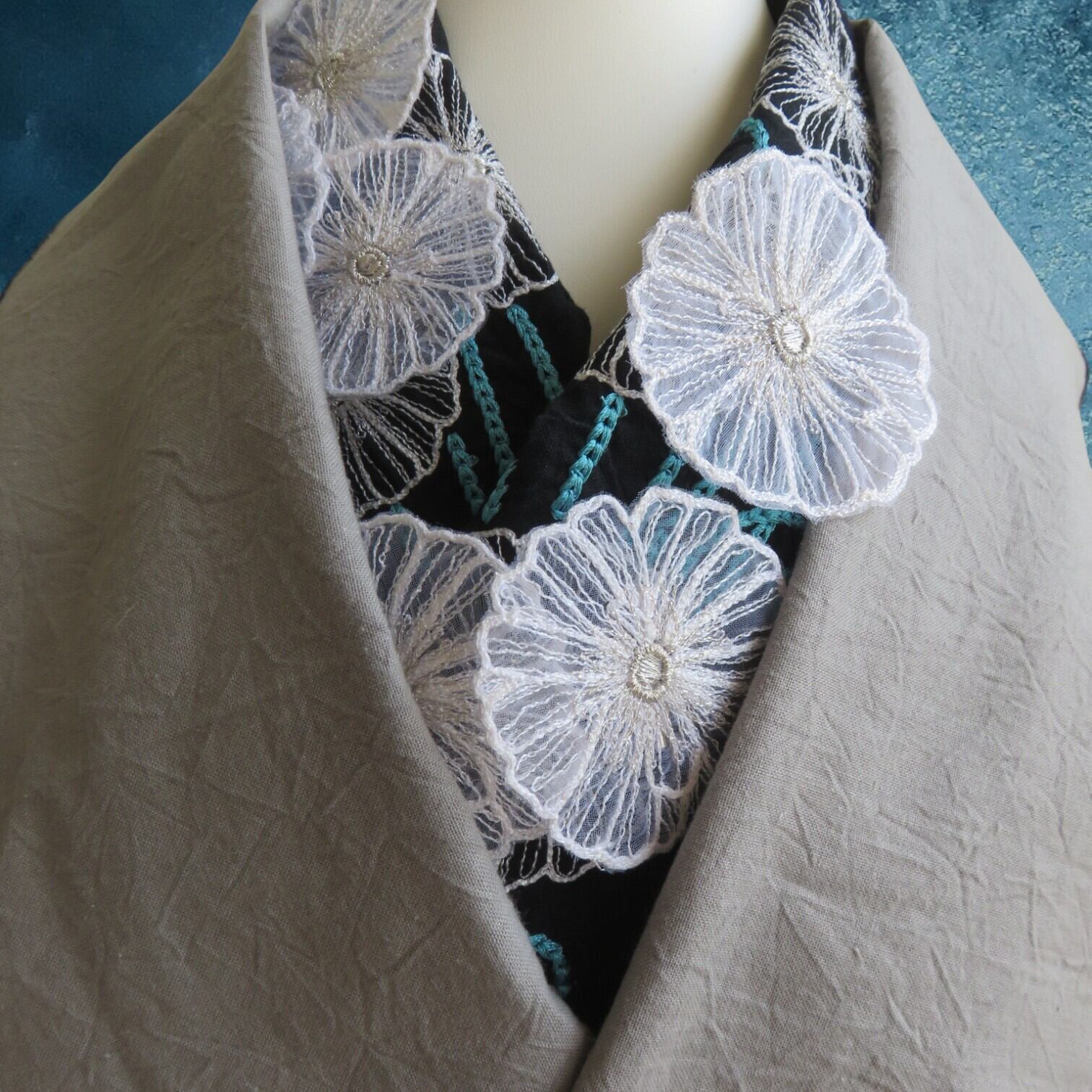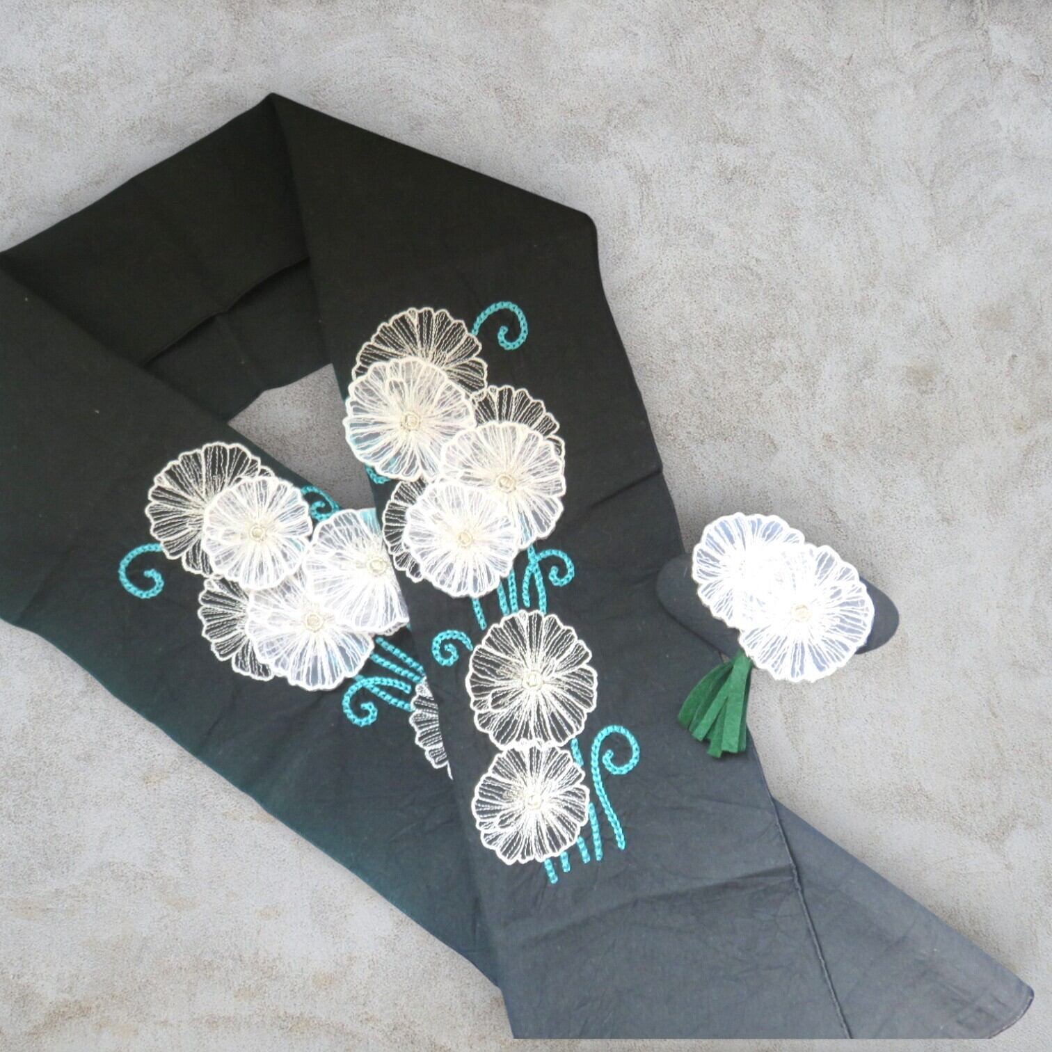 半襟と同じお花を6個のオーガンジーで作ったブローチがアクセントに。