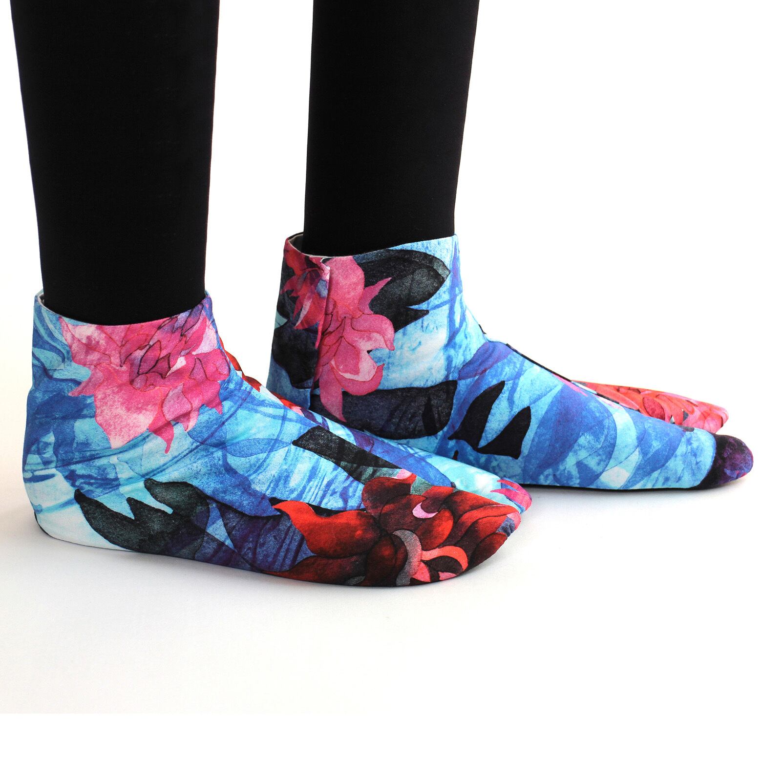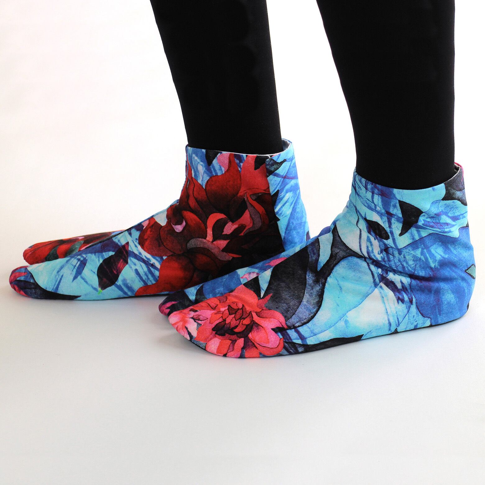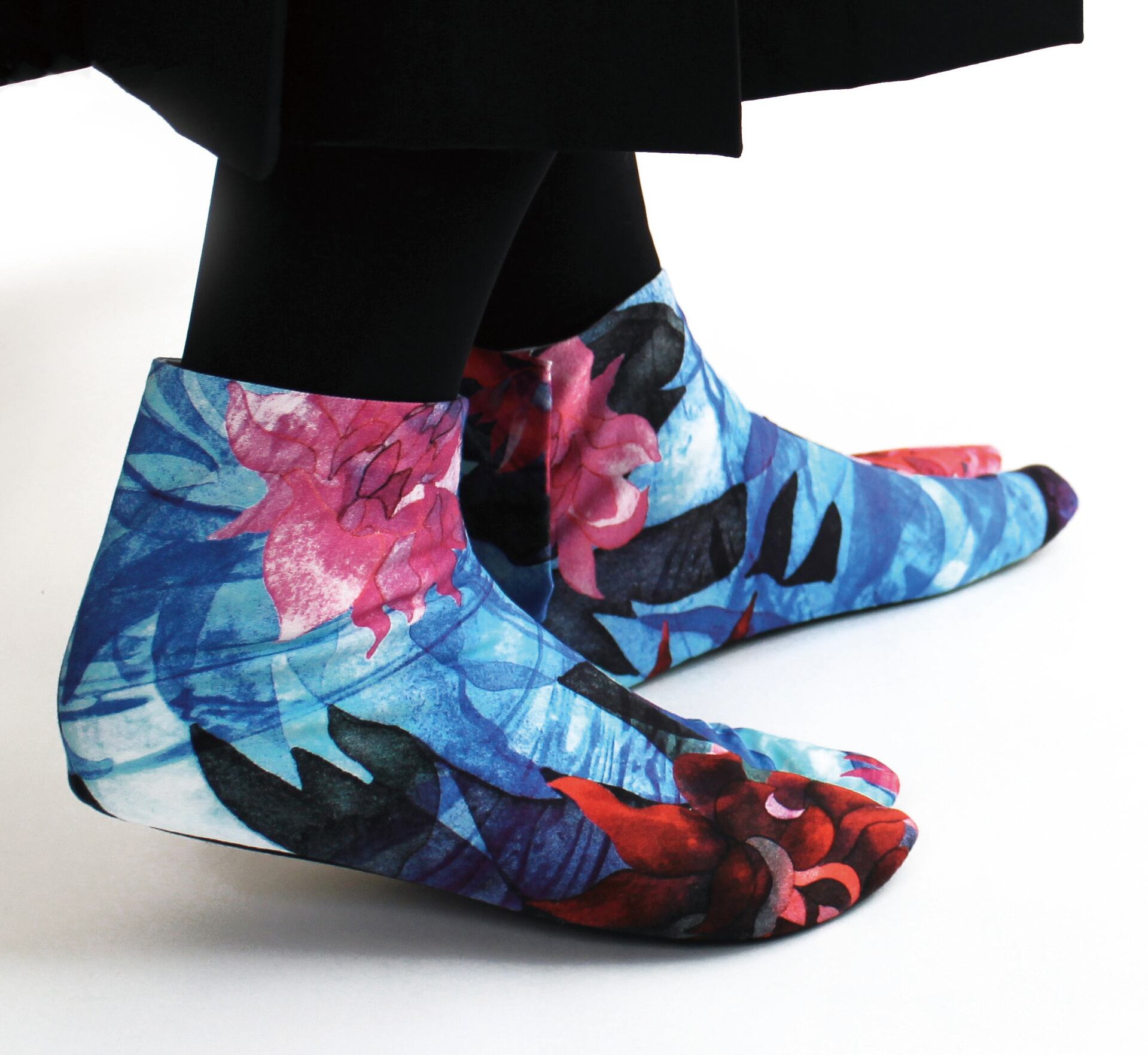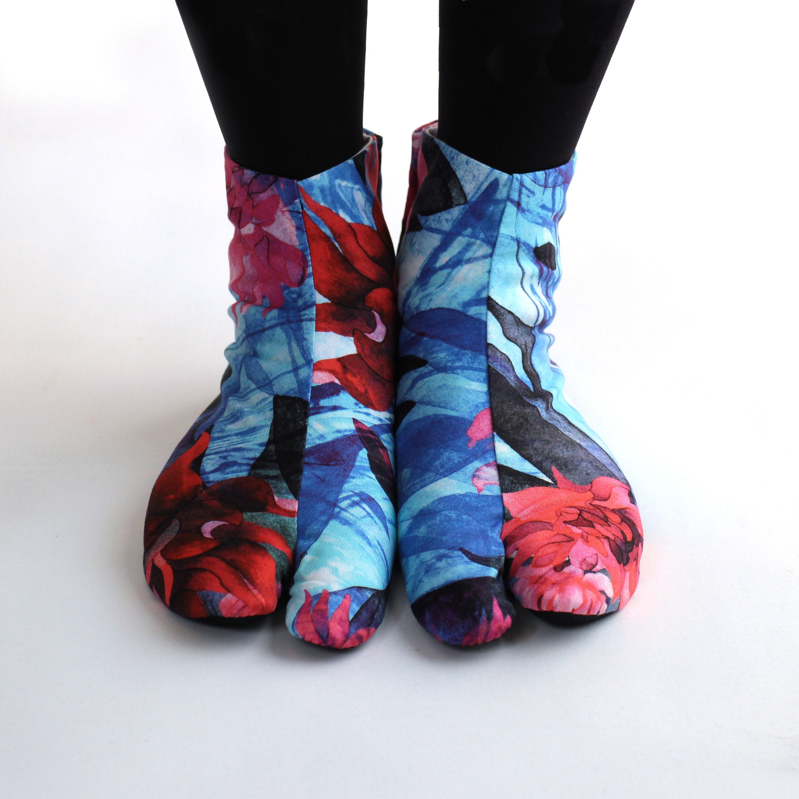 言葉では表現できない感覚やインスピレーションを描いたグラフィックアートのオリジナルファブリックを足袋職人さんによって丁寧に仕立て頂いています。