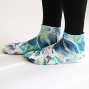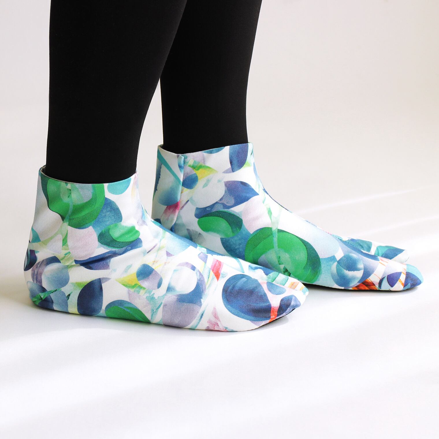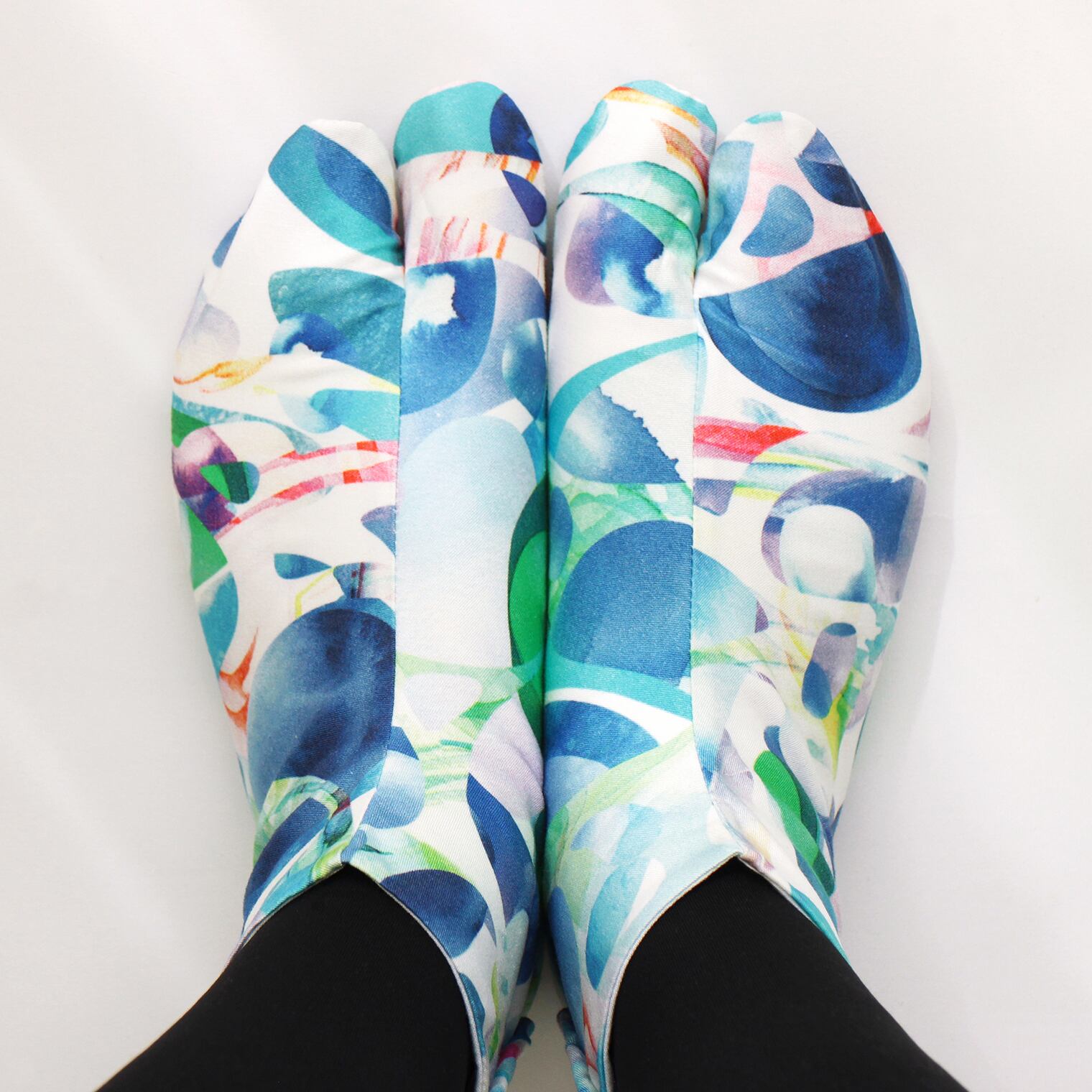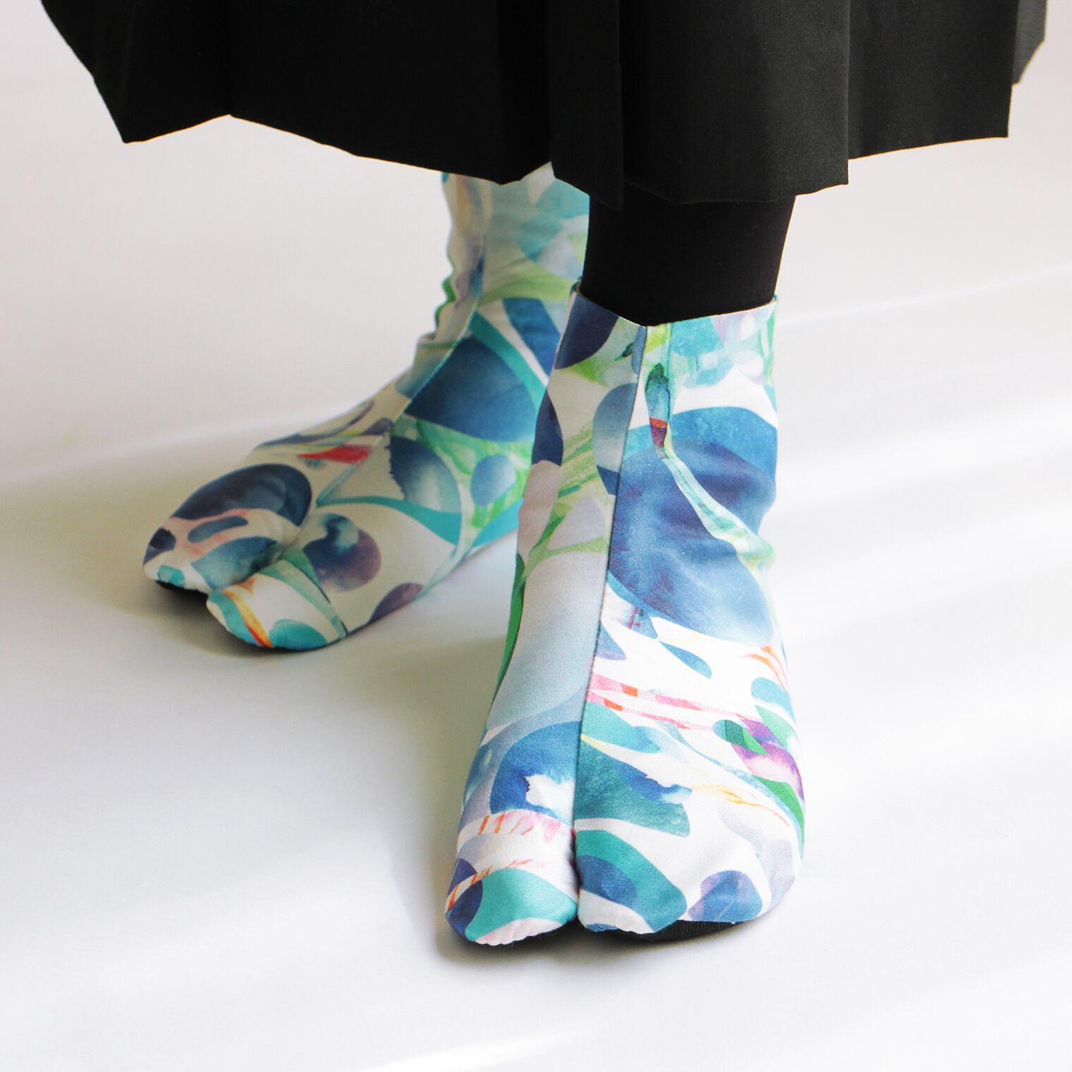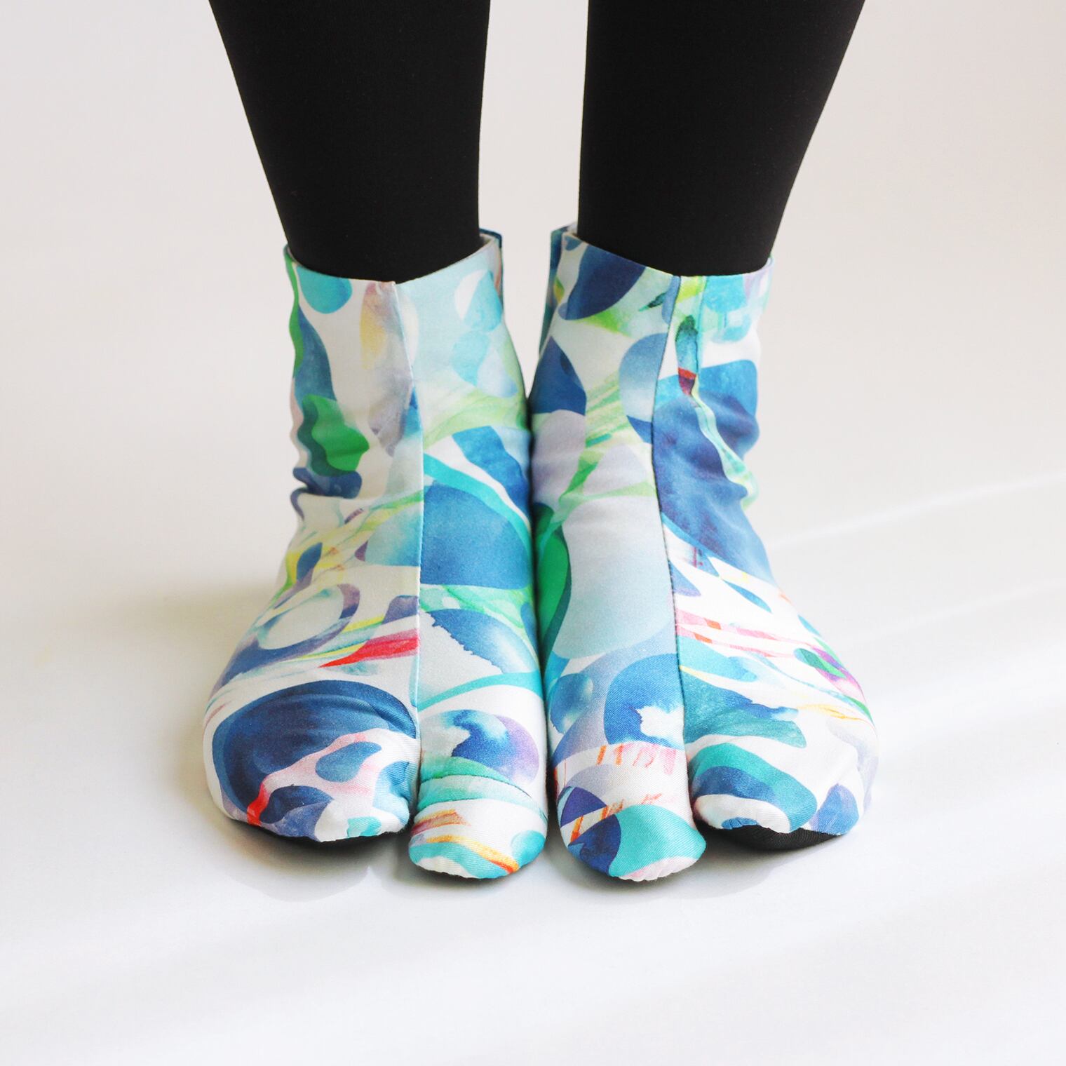 言葉では表現できない感覚やインスピレーションを描いたグラフィックアートのオリジナルファブリックを足袋職人さんによって丁寧に仕立て頂いています。